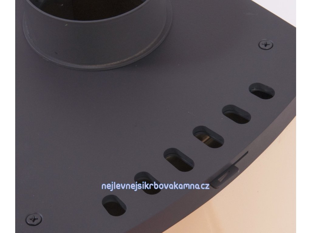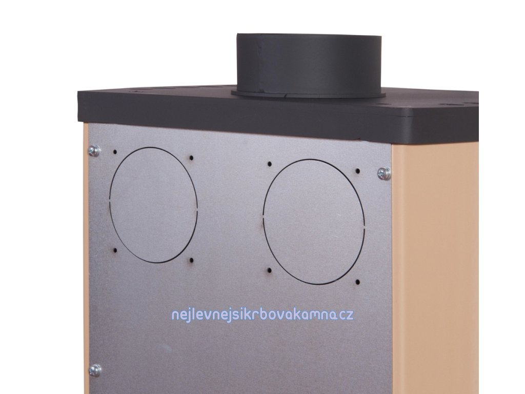 Zadní stěna druhého pláště krbových kamen umožňuje napojení na rozvod teplého vzduchu pro vytápění dalších místností - hrdla pro připojení jsou součástí balení.