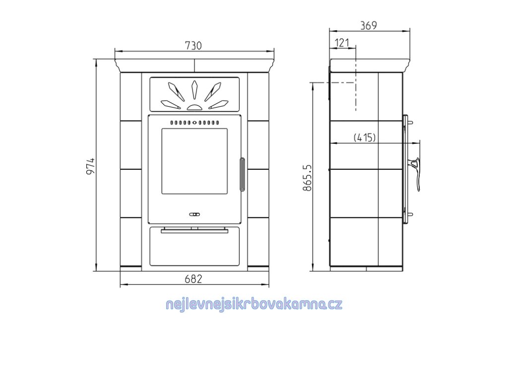 Nominální výkon: 8,1 kW, rozměry v cm (šxhxv): 54/39/96, hmotnost: 81 kg, průměr kouřovodu: 150 mm