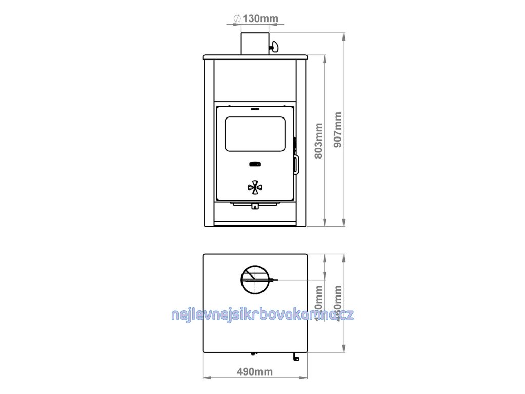 Nominální výkon: 8,1 kW, rozměry v cm (šxhxv): 53/40/110, hmotnost: 100 kg, průměr kouřovodu: 150 mm