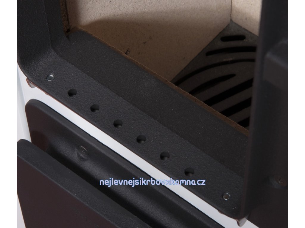 Zadní stěna druhého pláště krbových kamen umožňuje napojení na rozvod teplého vzduchu pro vytápění dalších místností - hrdla pro připojení jsou součástí balení.