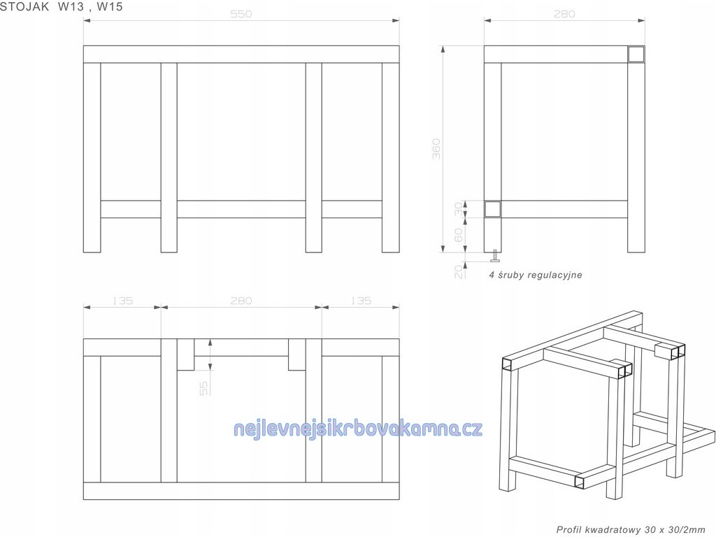 Rozměry rámu 280 x 550 x 380 mm - vyrobeno z ocelového profilu 30 x 30 mm o tloušťce stěny 2 mm
